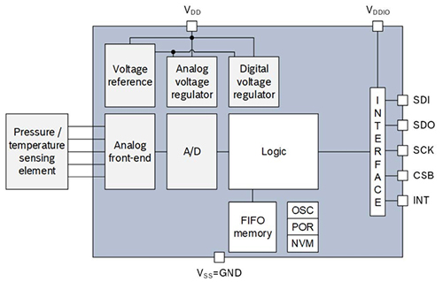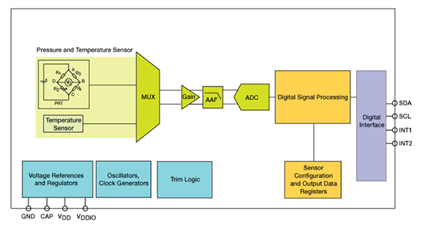 LGA 封裝帶孔,允許外部壓力到達(dá)傳感元件。該傳感器為壓阻式傳感器,包括檢測元件和一個(gè)通過 I2C 或 SPI 將檢測元件連接到應(yīng)用的 IC 接口。
