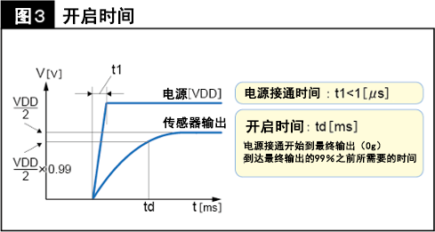 「開啟時(shí)間」是指接通電源后,在元件變?yōu)镺N狀態(tài)之前所需耗費(fèi)的時(shí)間。圖3即是用圖表形式來(lái)表示到達(dá)最終輸出的99%之前所需要的時(shí)間。