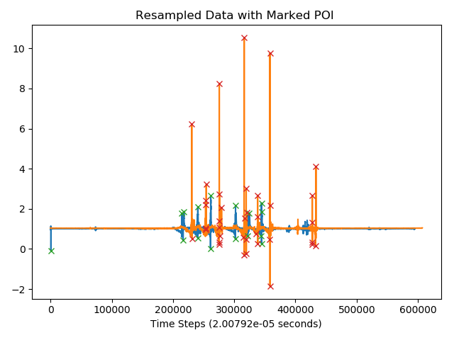 圖3:記錄已重新采樣,并且其“興趣點”在圖上標有“ X”。這些點旨在捕獲在兩個信號中都已記錄的主要“事件”