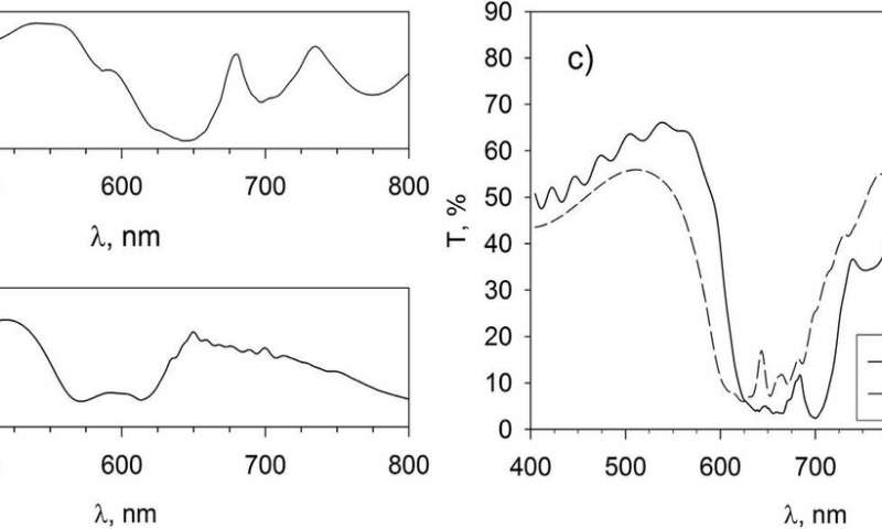 a)具有30 nm Au層的PPC的透射光譜。b)獨立的40納米金連續(xù)層的透射光譜。c)帶帽的PPC的透射光譜。虛線是獨立的40納米金制帽的光譜范圍 圖片來源:喀山聯(lián)邦大學(xué)