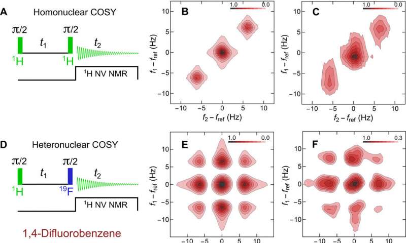 DFB的2D COZY NMR。(A)同核COZY脈沖序列,(B)模擬光譜,以及(C)DFB的實驗NV NMR光譜。(D)在(E)模擬和(F)實驗中,修飾的異核COZY序列均顯示非對角峰。色標對應(yīng)于2D傅立葉變換的歸一化絕對值。垂直軸(f1-fref)對應(yīng)于t1維度的頻率,而水平軸(f2-fref)對應(yīng)于t2維度的頻率。在(C)中,使用了t1的14個值,以0.021-s的增量遞增,直到0.294 s?偛杉瘯r間為22小時。在(F)中,使用了t1的16個值,以0.021-s的增量遞增,直到0.336 s?偛杉瘯r間為25小時。在這兩種情況下,t2采集的時間從0到1.25 s。所有模擬都是使用SPINACH軟件包執(zhí)行的。模擬和實驗數(shù)據(jù)使用相同的窗口功能。圖片來源:Science Advances,doi:10.1126 / sciadv.aaw7895。
