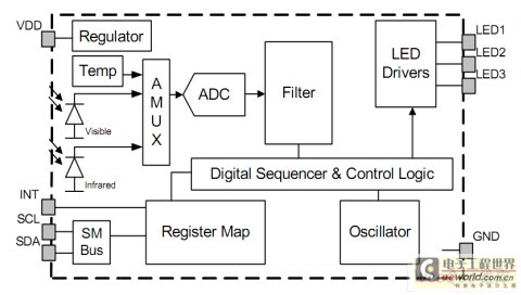 Si1143 紅外接近傳感器包括三個紅外LED驅(qū)動器,紅外線光電二極管,一個環(huán)境光傳感器和控制邏輯IC組成,外部的發(fā)射LED可以根據(jù)用戶的需要靈活安裝和配置。如圖1所示。