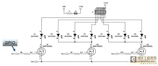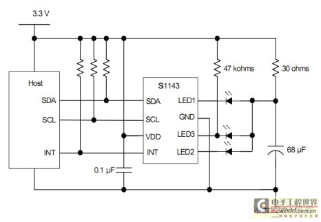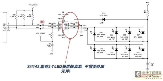 與Si1120不同的是,Si1143帶了三個LED驅(qū)動,當(dāng)連接多個紅外LED時,如果只有單個LED驅(qū)動(如圖6所示),則需通過MCU來控制MOS管分時驅(qū)動LED,而Si1143(如圖7所示)本身就已具備3個LED驅(qū)動,所以可以直接連接到不同的LED 引腳,勿需再另加外圍器件,為硬件設(shè)計節(jié)省了成本。另外,Si1143采用?SMBus接口,可兼容I2C通訊,通用性更強(qiáng),同時也方便軟件的設(shè)計。