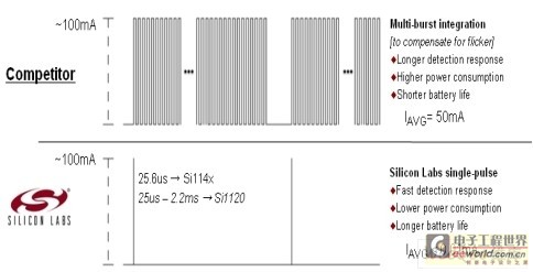 不像競爭方案的紅外線LED必須長時間進(jìn)行多次脈沖以達(dá)到精確的測量,Si1143紅外接近傳感系列使用專利的單一脈沖接近測量技術(shù)(如圖4所示),在電源效率上可達(dá)到5000倍的改善,電池壽命得以延長。