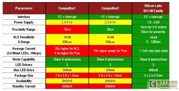 Si1140系列紅外接近傳感器與競爭對手在一些性能上的對比(如圖8所示):