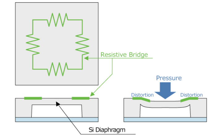 產(chǎn)生惠斯通電橋的壓阻式壓力傳感器。圖片由羅姆提供
