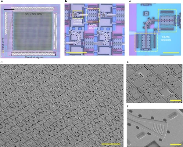 由此產(chǎn)生的設(shè)備在 1 平方厘米的固態(tài)芯片上創(chuàng)建了 128x128 像素陣列。研究人員聲稱,該芯片上的 16,348 像素遠(yuǎn)遠(yuǎn)超過了之前達(dá)到的數(shù)量,使其成為市場上分辨率的固態(tài) FPSA 芯片。