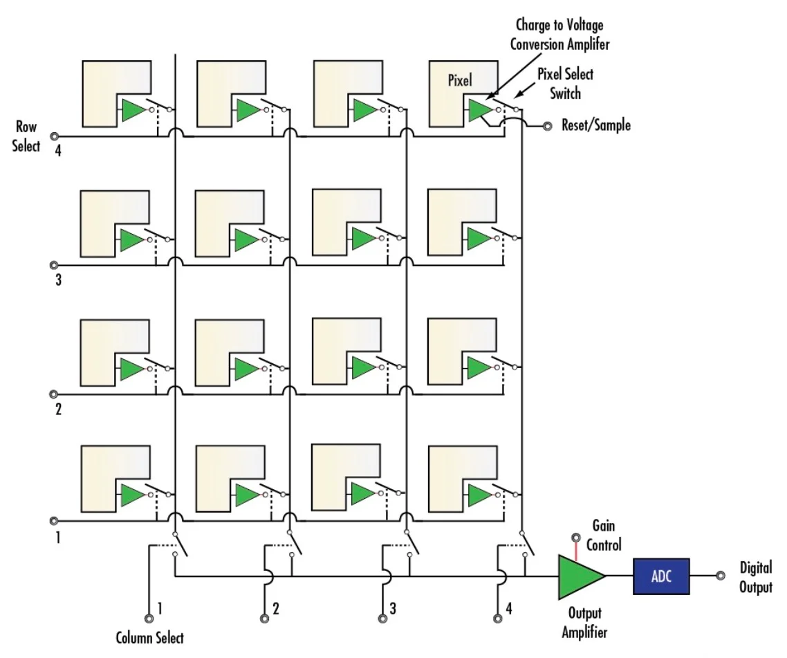 光電探測器的二維陣列用于感測入射光強度。光電探測器產(chǎn)生的電荷被轉(zhuǎn)換為電壓信號,并通過“行選擇”和“列選擇”開關(guān)陣列傳遞到輸出放大器。ADC 用于數(shù)字化放大的信號。