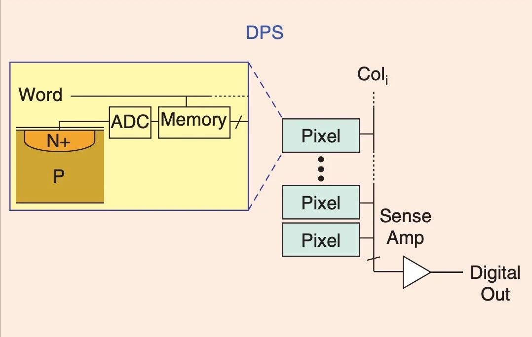 上圖顯示了一個 APS(主動像素傳感器)架構(gòu)。在 APS 器件中,每個像素位置不僅包含光電二極管,還包含放大器。一種更簡單的架構(gòu),稱為 PPS(無源像素傳感器),不會將放大器集成到像素中。在 DPS(數(shù)字像素傳感器)設(shè)備中,每個像素都有自己的模數(shù)轉(zhuǎn)換器和內(nèi)存塊。因此,DPS 架構(gòu)中的像素輸出與光強度成比例的數(shù)字值。