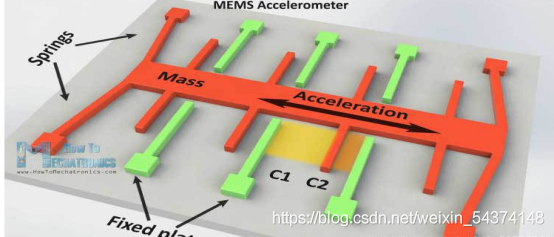 首先了解一下MEMS加速度計的原理,簡圖如下圖所示,其中質量塊mass被彈簧springs支撐,使得其只能沿著預定方向位移,從而檢測特定方向的加速度;綠的部分是固定的電極板Fixed plates。檢測原理是當質量塊感受到加速度時,會在相應方向產(chǎn)生位移,從而使得固定電極板構成的兩個平行板電容器C1,C2的電容大小發(fā)生改變,檢測其電容值大小即可換算成相應的加速度