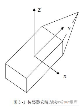 在本系統(tǒng)中,三軸加速度計(jì)和三軸 MR 傳感器都以以下的方式安裝于電路板上:它們 的X 軸平行于系統(tǒng)的橫軸指向右,Y 軸平行于系統(tǒng)的縱軸指向前,X、Y、Z 軸定義為右手 坐標(biāo)系統(tǒng),如圖3 -1 所示。