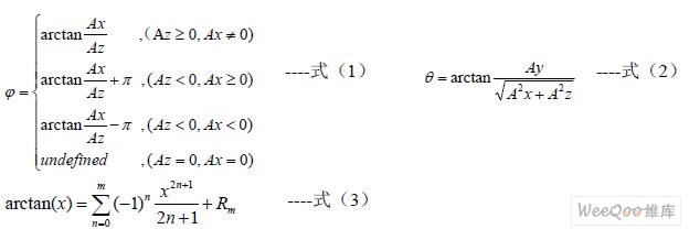 為了獲得系統(tǒng)基于重力向量的俯仰角θ 和橫滾角φ,需要使用加速度計(jì)的三個(gè)輸出:Ax, Ay, Az 。俯仰角和橫滾角可以通過(guò)以下公式(1)和公式(2)計(jì)算得到。對(duì)于微控制器,函數(shù) 中的arctan(x) 需要通過(guò)以下公式(3)的泰勒展開(kāi)后才能計(jì)算得到。