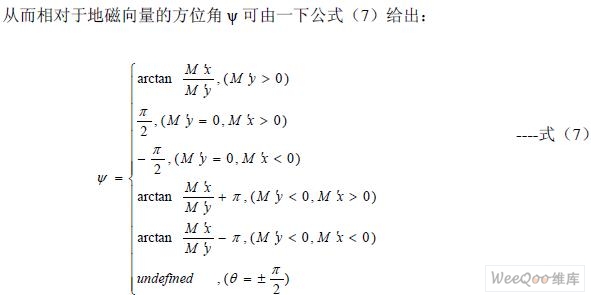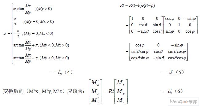 為了獲得系統(tǒng)相對(duì)于當(dāng)?shù)氐卮畔蛄康姆轿唤,需要使用MR 傳感器的三個(gè)輸出Mx, My, Mz 。當(dāng)系統(tǒng)置于水平狀態(tài)時(shí)(俯仰角和橫滾角都為0)時(shí),方位角ψ 可以由公式(4)直 接給出,但是在大多數(shù)情況下,系統(tǒng)并不是工作在水平狀態(tài),此時(shí)地磁場(chǎng)的豎直分量將會(huì)影 響Mx 和My 的值,因此不能直接由公式(4)獲得相對(duì)于地磁向量的方位角。為了在所有 情況下都能獲得正確的方位角,必須將俯仰角和橫滾角考慮在內(nèi),即必須通過(guò)以俯仰角和橫 滾角為參數(shù)的坐標(biāo)變換,將測(cè)得的(Mx, My, Mz)向量變換為與載體坐標(biāo)系有相同方位角的 水平坐標(biāo)系下的向量(M’x , M’y, M’z),其變換矩陣如公式(5)。