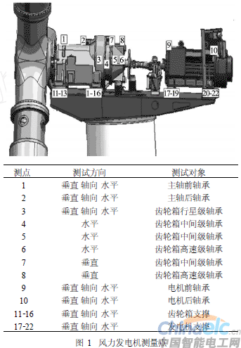 現(xiàn)場測量點的布置對于風(fēng)力發(fā)電機在線監(jiān)測和診斷系統(tǒng)來說一直是個難題,至今也沒有得到很好的解決,F(xiàn)場測量點選擇的不同,對于監(jiān)測系統(tǒng)信號分析具有很大的影響。不同的布置方案,得到的結(jié)果不盡相同。