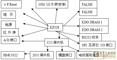 本文的課題背景是一個(gè)機(jī)器人玩具的控制系統(tǒng)設(shè)計(jì),主芯片采用的是以摩特羅拉公司的MC86EZ328芯片,只完成與通信、運(yùn)算等有關(guān)的主要操作,在沒(méi)有操作時(shí),由運(yùn)行于其上的操作系統(tǒng)uClinux來(lái)維護(hù)。對(duì)于所有與EZ328的核心運(yùn)算、控制、通信、操作無(wú)關(guān)的外圍設(shè)備的維護(hù)和控制都通過(guò)一塊AT89C52來(lái)完成,它與EZ328的底層通信協(xié)議為同步串口協(xié)議(SPI),在AT89C52中由軟件來(lái)實(shí)現(xiàn)。C52包含的部件主要是A/D轉(zhuǎn)換器,鍵盤接口,電機(jī)驅(qū)動(dòng)模塊。硬件結(jié)構(gòu)電路圖如下圖1: