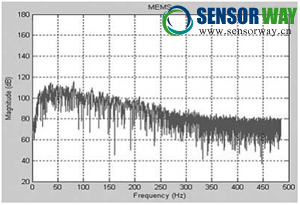 從圖中可明顯看出,壓阻式傳感器采集到的振動(dòng)信號比動(dòng)圈式采集到的振動(dòng)信號內(nèi)容豐富,后者有明顯的信號丟失,而前者的信號幅度在環(huán)境等同條件下明顯增強(qiáng)。雖然作為無源傳感器的機(jī)械動(dòng)圈式傳感器具有 低噪聲的特點(diǎn),但壓阻式的信噪比要比動(dòng)圈式大的多,達(dá)6dBv,后面的幅頻特性對比曲線將說到這一點(diǎn)。
