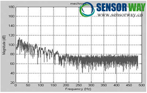 從圖3、圖4上可明顯的看出二者的差別。壓阻式振動(dòng)加速度傳感器在300Hz內(nèi)的通頻帶內(nèi)平坦、線信度 好,能真實(shí)地反應(yīng)振動(dòng)信號的大小;而動(dòng)圈式振動(dòng)加速度傳感器的帶寬不足300Hz,且通頻帶極不平坦, 線信度不好,放大后,反映的是畸變的振動(dòng)信號。動(dòng)圈式振動(dòng)加速度傳感器已無法采集100Hz以上的振動(dòng) 信號,后面的幅頻特性圖對比更能說明這一點(diǎn)。
