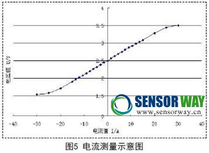 在實際應用中,待測電流有正負之分,產生的磁場有正負之分,因此,在測試過程中,通過改變磁場方向和電流的方向來檢測GMR傳感器和電流傳感器測試性能。圖5是電流從-30A到+30A變化時電流傳感器輸出曲線。
