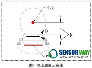 巨磁電阻用于電流檢測一般采用如圖4所示的方式進行,將磁傳感器放置通電導線的正上方或正下方,同時保證通電導線產生磁場的方向與磁傳感器的敏感方向一致。按照通電導線周圍產生磁場的理論計算公式2-1可知,在待測電流和傳感器相對位置一定的情況下,待測電流的大小和磁場大小成正比,利用公式2-2這樣就可以直接測量待測電流產生的磁場值,再結合公式2-1就得出待測電流的大小。