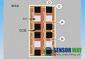 對不同位置傳感器所帶來的影響進(jìn)行了一項研究。功率模塊的一個模型如圖 2所示。該模塊沒有銅底板,安裝在一個風(fēng)冷鋁散熱器上。不同傳感器的熱耦合不同,從傳感器A)在同一銅層上與功率半導(dǎo)體直接相連,到傳感器B)和C)在模塊內(nèi)不同位置進(jìn)行隔離,到放置在散熱器上模塊旁的傳感器D)。由于不同的熱耦合,每個傳感器有不同的結(jié)( j )到傳感器(r)熱阻Rth(j-r)。