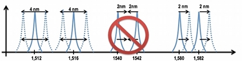 圖4.同一條光纖上掛接的每一個FBG傳感器必須具有其獨立的工作波長范圍