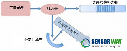 在這種方法中,會用一個廣譜的光源照射FBG傳感器(或者一系列FBG傳感器)。這些反射光束會通過一個分散性單元,分散性單元會將波長不同的反射光束分別分配到電荷耦合器件(CCD)表面不同的位置上去。如下圖5所示。