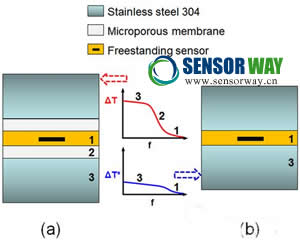 近日,中國科學院工程熱物理研究所傳熱傳質研究中心科研人員針對這一微尺度熱物性測量難題進行了較深入研究?蒲腥藛T提出了一種自適應基于獨立型傳感器的3ω技術(圖1、圖2),通過分別測試5層對稱結構(基底-微孔膜-傳感器-微孔膜-基底)及作為對照組的3層對稱結構(基底-傳感器-基底)的獨立型傳感器的溫度響應信號(圖1),結合提出的數(shù)學模型,可以較為準確地得到數(shù)十微米厚微孔膜的有效熱導率。