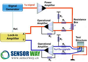 圖2 用于微孔膜測量的自適應基于獨立型傳感器的3ω系統(tǒng),包含:信號發(fā)生器、鎖相放大器、前置放大器、運算模塊(運放、低溫漂電阻)及計算機自動控制系統(tǒng)。