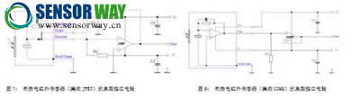 熱勢(shì)電是紅外傳感器中重要的一種,其傳感器及其典型接口電路如圖7和圖8所示,框中部分是傳感器,內(nèi)部集成有JFET和CMOS運(yùn)放兩種形式。對(duì)外部均需要精密運(yùn)算放大器對(duì)輸出的信號(hào)進(jìn)行調(diào)理。溫度的變化對(duì)于此類傳感器影響較大,一般有溫度校正的環(huán)節(jié)。