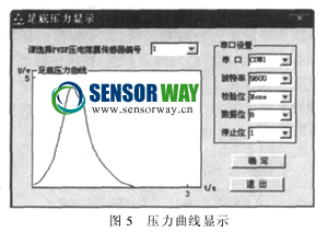 數(shù)據(jù)采集和模數(shù)轉(zhuǎn)換是借助DP-51PROC單片機(jī)綜合仿真實(shí)驗(yàn)儀來完成的。采集的數(shù)據(jù)通過RS-232串口通信傳送至計(jì)算機(jī)進(jìn)行處理與顯示。本文用VC+ +6.0編程實(shí)現(xiàn)串口通信,并進(jìn)行數(shù)據(jù)處理。測試時(shí),由人體足底前掌部對傳感器陣列施加一動態(tài)壓力,經(jīng)過數(shù)據(jù)處理,可獲取每只傳感器對應(yīng)的壓力曲線。圖5為某一時(shí)刻,第1只PVDF壓電薄膜傳感器(位于第5跖骨)對應(yīng)的壓力曲線。僅從圖形上相比較,該結(jié)果與文獻(xiàn)記載的足底壓力曲線相似。一旦對PVDF壓電薄膜進(jìn)行標(biāo)定,便能準(zhǔn)確測量出該部位在任一時(shí)刻的壓力大小。