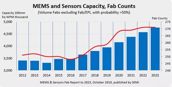 據(jù)全球半導(dǎo)體生產(chǎn)設(shè)備材料協(xié)會(huì)(SEMI)日前發(fā)布的報(bào)告預(yù)測顯示,2018年-2023年期間,生產(chǎn)MEMS/Sensor(傳感器)的Fab的產(chǎn)能將會(huì)增加25%,月產(chǎn)能增至470萬片(以200nm晶圓換算)。這是受到通信、汽車、醫(yī)療、移動(dòng)、工業(yè)和物聯(lián)網(wǎng)(IoT)等其他應(yīng)用需求的驅(qū)動(dòng)。