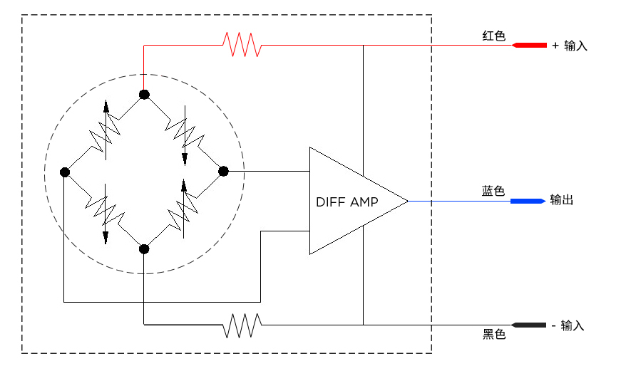 圖 3 :帶有惠斯通電橋和放大器的壓阻式力傳感器的示意圖