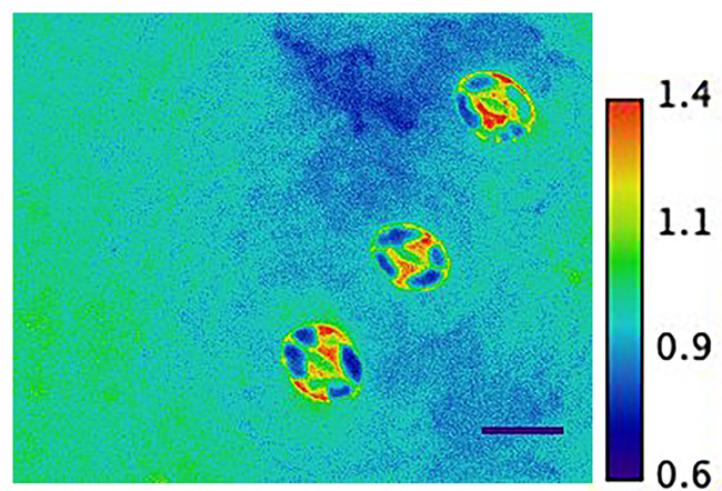 該圖像描繪了三個(gè)擬南芥葉表面的孔或氣孔,它們表達(dá)了由加州大學(xué)圣地亞哥分校的植物生物學(xué)家開發(fā)的新型SNACS應(yīng)力納米傳感器。圖片來源:圣地亞哥加州大學(xué)施羅德實(shí)驗(yàn)室