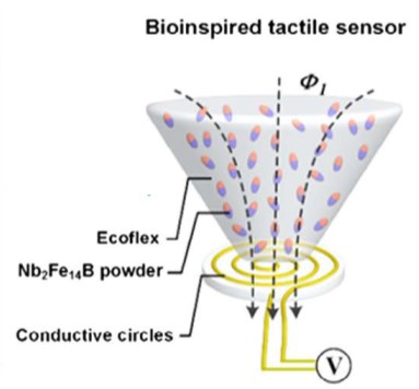 本研究的研究人員設(shè)計(jì)了一種新型的輕觸傳感器,該傳感器模仿了在我們皮膚中發(fā)現(xiàn)的默克爾圓盤的功能和結(jié)構(gòu)-對輕觸產(chǎn)生反應(yīng)的神經(jīng)末梢。新的觸覺傳感器利用了磁電效應(yīng),它由兩個(gè)不同的部分組成:第一個(gè)是復(fù)合混合物,由磁粉和彈性體組成,形成一個(gè)彈性磁塊,實(shí)際上它對默克爾圓盤的反應(yīng)相似。傳感器的后半部分由導(dǎo)電的盤繞銅線組成(見圖)。