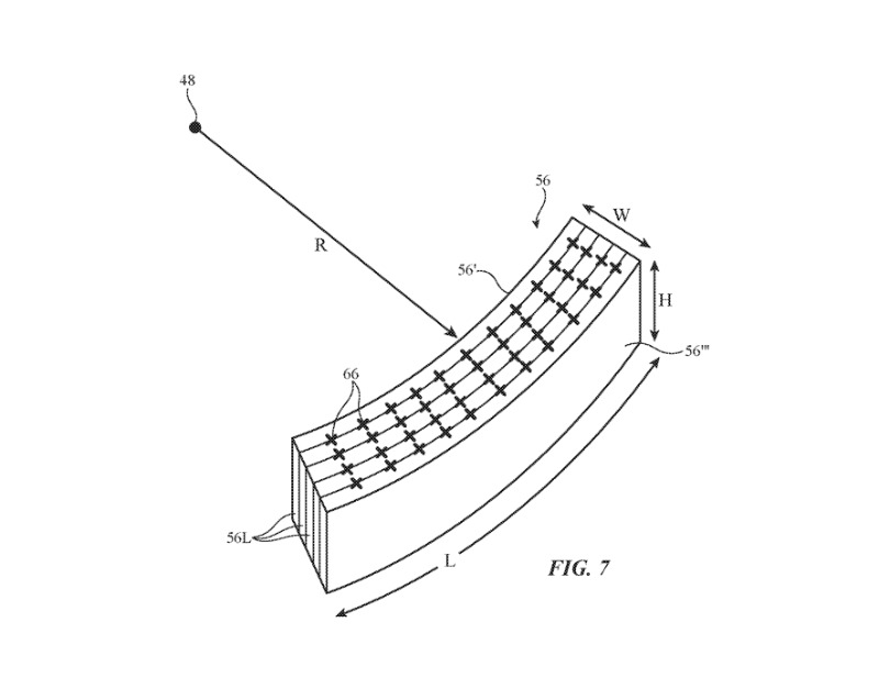 這是關鍵部分,這種光學傳感器可能會被布置并彎曲,以占用盡可能少的空間。蘋果公司說:“每個光控部件都可以由一疊層壓彎曲的光控膜形成。” “用于堆疊的光控膜可以使用具有彎曲表面的層壓工具壓制成所需的彎曲形狀。”