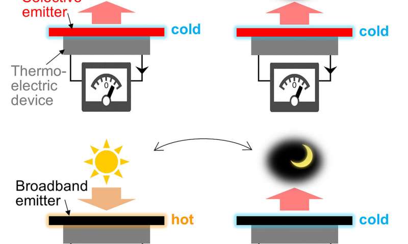在本周于《應(yīng)用物理學(xué)快報(bào)》上發(fā)表的一項(xiàng)研究中,作者測(cè)試了一種由波長選擇發(fā)射器組成的熱電設(shè)備,該設(shè)備在白天使用輻射冷卻不斷地冷卻該設(shè)備,使熱能從設(shè)備中散布到空氣中。結(jié)果,設(shè)備的頂部比底部的溫度更低,從而導(dǎo)致溫差,從而在白天和黑夜以及各種天氣條件下產(chǎn)生恒定電壓。