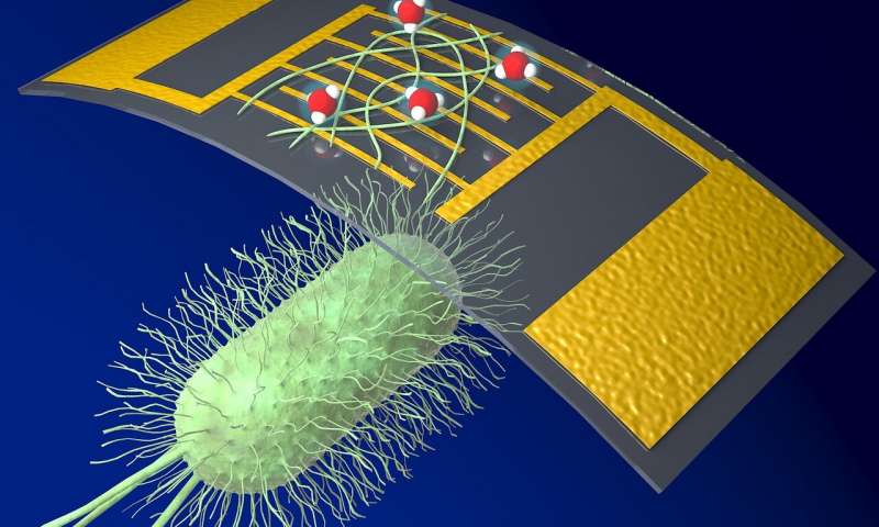 該傳感器使用源自細(xì)菌Geobacter 的導(dǎo)電蛋白納米線為電子設(shè)備提供生物材料。30多年前,資深作家和微生物學(xué)家德里克·洛夫利(Derek Lovley)在河泥中發(fā)現(xiàn)了Geobacter。微生物會(huì)長出像頭發(fā)一樣的蛋白質(zhì)細(xì)絲,充當(dāng)納米級(jí)“金屬絲”,以轉(zhuǎn)移電荷來滋養(yǎng)它們并與其他細(xì)菌交流。
