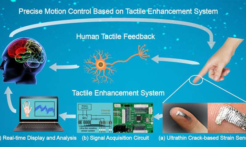 在本周的《應用物理評論》上,科學家報告了基于高靈敏度傳感器的新型觸覺增強系統(tǒng)的開發(fā)。該傳感器具有卓越的靈敏度,使佩戴者能夠檢測出羽毛的光筆,花瓣的觸感,落在手指上的水滴,甚至是太細小的電線都看不到。