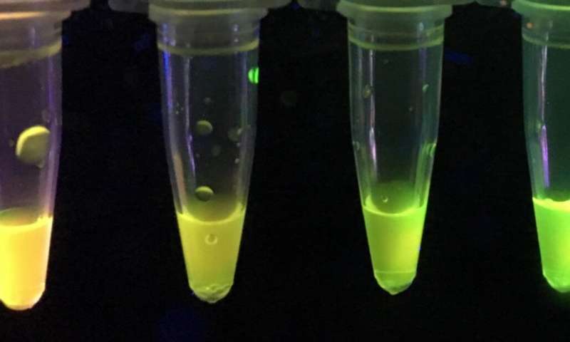 由美國(guó)化學(xué)大學(xué)的化學(xué)家開(kāi)發(fā)的一種新傳感器在紫外光下會(huì)根據(jù)樣品中對(duì)硫磷或?qū)ρ趿椎暮慷優(yōu)辄S色或綠色。圖片來(lái)源:克里斯·羅比迪洛(Chris Robidillo)