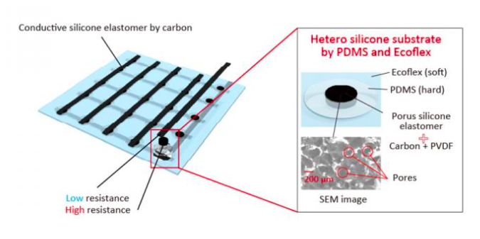 在發(fā)表的論文中,研究人員描述了使用兩種不同的材料(一種軟材料和一種硬材料)來(lái)保護(hù)傳感器伸展和準(zhǔn)確測(cè)量運(yùn)動(dòng)的能力。將硬硅樹脂(PDMS)沿著電極放置在陣列上方,并且在每個(gè)放置的核心處,他們都放置了可感知壓力的柔軟的多孔硅樹脂。