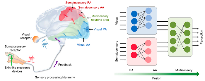 為了應(yīng)對這一挑戰(zhàn),南大新加坡團(tuán)隊(duì)開發(fā)了一種“生物啟發(fā)”的數(shù)據(jù)融合系統(tǒng),該系統(tǒng)將類似皮膚的可拉伸應(yīng)變傳感器與AI系統(tǒng)結(jié)合使用。這些技術(shù)結(jié)合在一起,類似于人腦共同處理皮膚的感覺和視覺的方式。