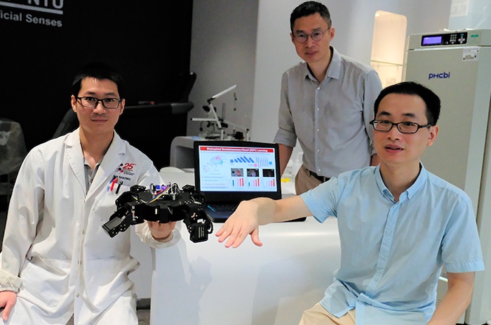 NTU新加坡的科學(xué)家將計(jì)算機(jī)視覺和類似皮膚的電子設(shè)備結(jié)合在一起,引導(dǎo)機(jī)器人穿過迷宮。圖片由NTU新加坡提供