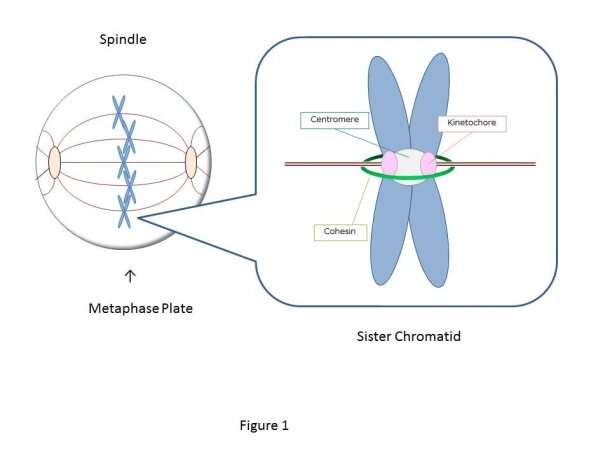 復(fù)制的染色體由稱為粘著蛋白(綠色)的環(huán)狀蛋白質(zhì)配對在一起,并成為姐妹染色單體。在姐妹染色單體中有兩個動植物(粉紅色:姐妹動植物),當(dāng)從相反的紡錘極延伸的繩狀微管捕獲每個動粒時,產(chǎn)生張力,并且染色體在中期板上對齊。來源:早稻田大學(xué)寺田實驗室