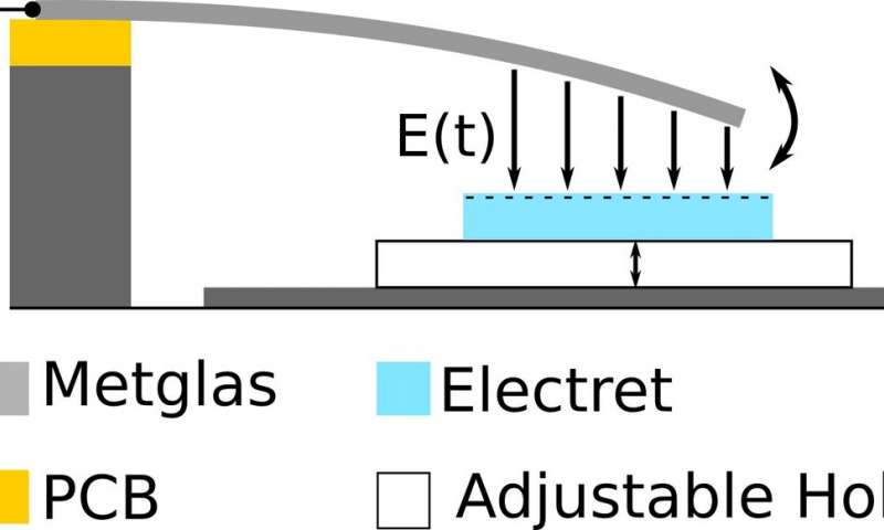 通過施加磁場,彎曲梁振動(dòng)。永久充電的駐極體(藍(lán)色)拉動(dòng)彎曲梁。這樣,他的振動(dòng)力變得更強(qiáng),并且發(fā)出的電信號(hào)也更強(qiáng)。學(xué)分:基爾大學(xué)