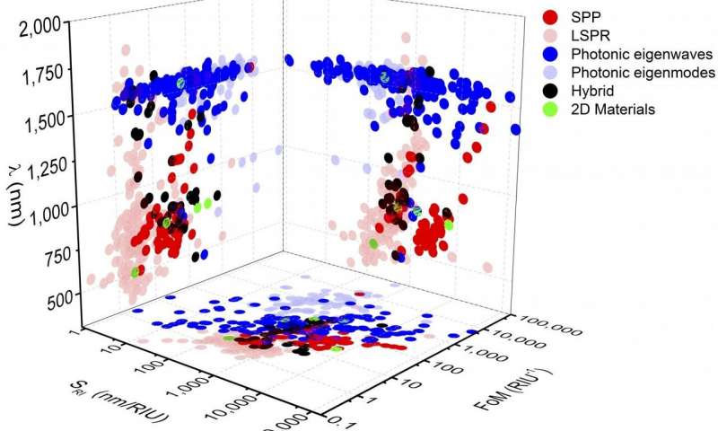 來自新加坡新加坡科技設(shè)計(jì)大學(xué)(SUTD),新加坡科學(xué)技術(shù)研究局(A * STAR)和奧地利奧地利技術(shù)學(xué)院的研究人員進(jìn)行了廣泛的文獻(xiàn)研究,系統(tǒng)地總結(jié)和比較了傳感能力這些光學(xué)折射率傳感器的靈敏度和優(yōu)劣系數(shù)的比較。然后建立了3-D技術(shù)圖(見圖1),以定義使用等離子和光子結(jié)構(gòu)的光學(xué)折射率傳感器的標(biāo)準(zhǔn)和發(fā)展趨勢。