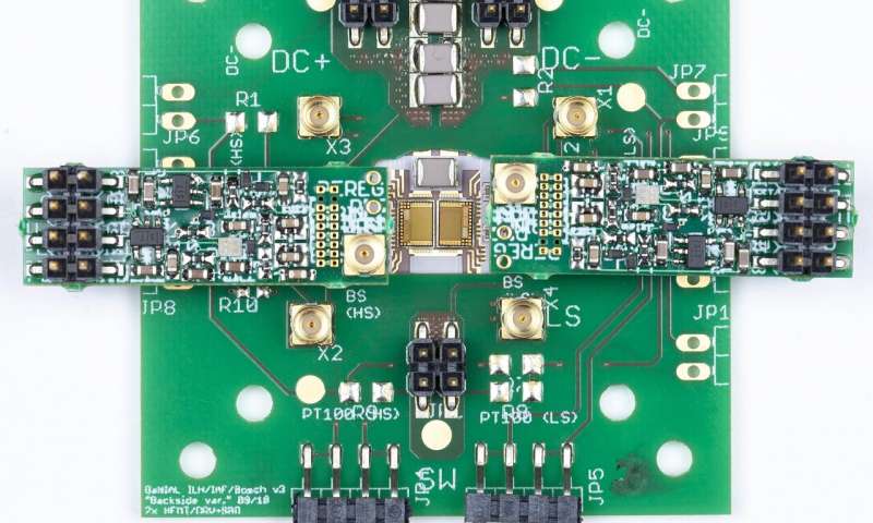 在電動汽車中,需要在有限的空間內(nèi)集成許多小型高效的系統(tǒng)。所示的電壓轉(zhuǎn)換器基于尺寸為4 x 3mm2的GaN電源IC。圖片來源:Fraunhofer IAF
