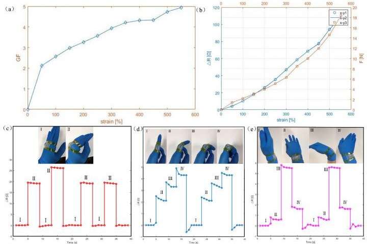 a)GF與菌株之間的關(guān)系。(b)電阻變化與應(yīng)變的關(guān)系。此傳感器的照片附在關(guān)節(jié)(c)/手指(d)/扭力(e)上,且動作不同,并且相應(yīng)的電阻發(fā)生了變化。