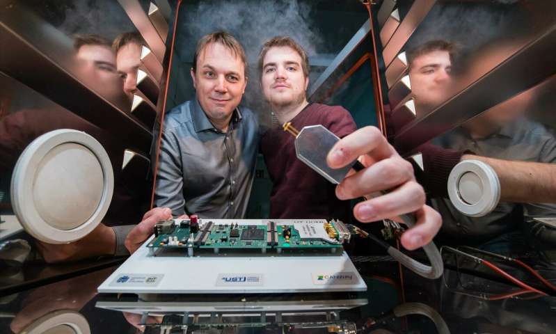 一個即使在高溫工業(yè)烤箱中也能精確測量空氣濕度的傳感器系統(tǒng):由AndreasSchütze教授領(lǐng)導(dǎo)的研究團(tuán)隊的項目經(jīng)理Tilman Sauerwald(左)和博士生Henrik Lensch。(照片來源:Oliver Dietze