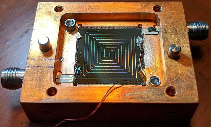 新型溫度計的尺寸僅為2.5 x 1.15毫米,可以安裝在另一個低溫微波設(shè)備中或固定在另一個低溫微波設(shè)備上,以測量安裝在芯片上的溫度。研究人員使用溫度計演示了超導(dǎo)微波放大器發(fā)熱的快速,準(zhǔn)確測量。