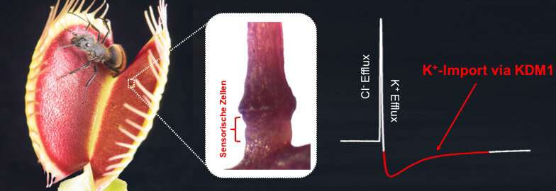 捕蠅草的潛在陷阱。中部:觸發(fā)發(fā)的基部,在觸覺刺激下,感覺細(xì)胞會誘發(fā)動作電位。在動作電位的后期,需要通過KDM1將鉀離子重新導(dǎo)入感覺細(xì)胞,以產(chǎn)生連續(xù)的動作電位。圖片來源:Ines Kreuzer,Soenke Scherzer /維爾茨堡大學(xué)